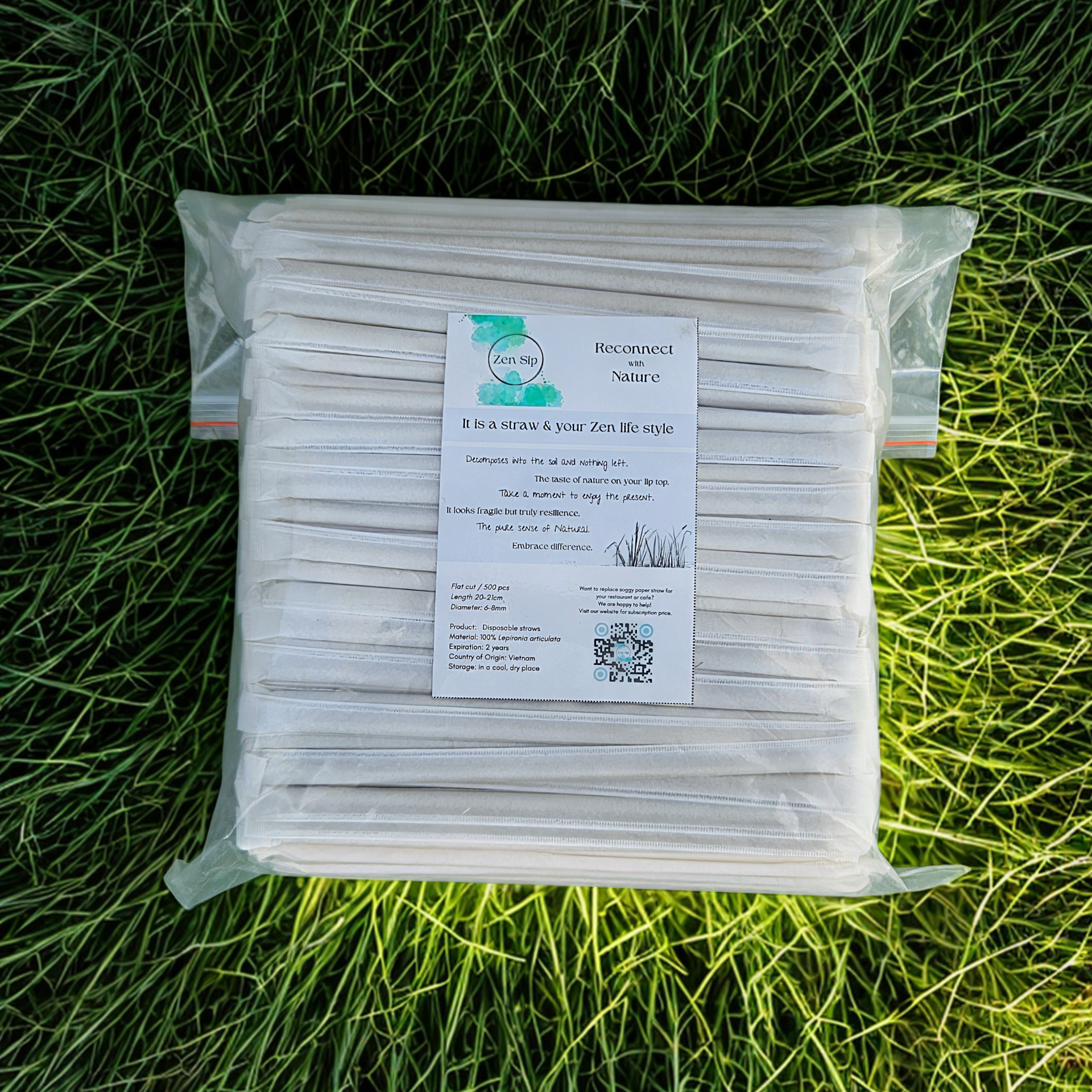 ZenSip is een wegwerprietje geïnspireerd door de natuur. Gemaakt van Lepironia articulata, een tropische moerasplant die groeit zonder pesticiden of kunstmest. ZenSip draagt bij aan het herstel van moerasgebieden en ondersteunt biodiversiteit via duurzame habitatregeneratie. Elke plant groeit 9–10 maanden op natuurlijke wijze voordat deze zorgvuldig wordt gewassen, bijgesneden, op hoge temperatuur wordt gedroogd en gedesinfecteerd. Getest en goedgekeurd volgens internationale normen (EU REACH-verordening, EU-verordening voor materialen in contact met voedsel EC Nr. 1935/2004).